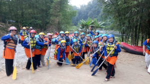 Mulailah kegiatan rafting, masing-masing kelompok menaiki perahu/ boat. Ada perasaan takut, penasaran, dan tantangan saat pertama kali menaiki perahu. Tapi semua itu berubah menjadi ceria saat perahu sudah mulai jalan, apalagi masing-masing kelompok melancarkan aksi bermain air untuk membasahi kelompok lainnya. Selama perjalanan peserta menyusuri sungai Elo dengan penuh semangat, kebersamaan, dan kompak masing-masing kelompok. Pada akhirnya sampailah finish di Citra Elo Magelang tempat pertama kali peserta berkumpul. Meskipun badan capai, tangan capai, semua tidak dirasakan dan terganti dengan keceriaan.